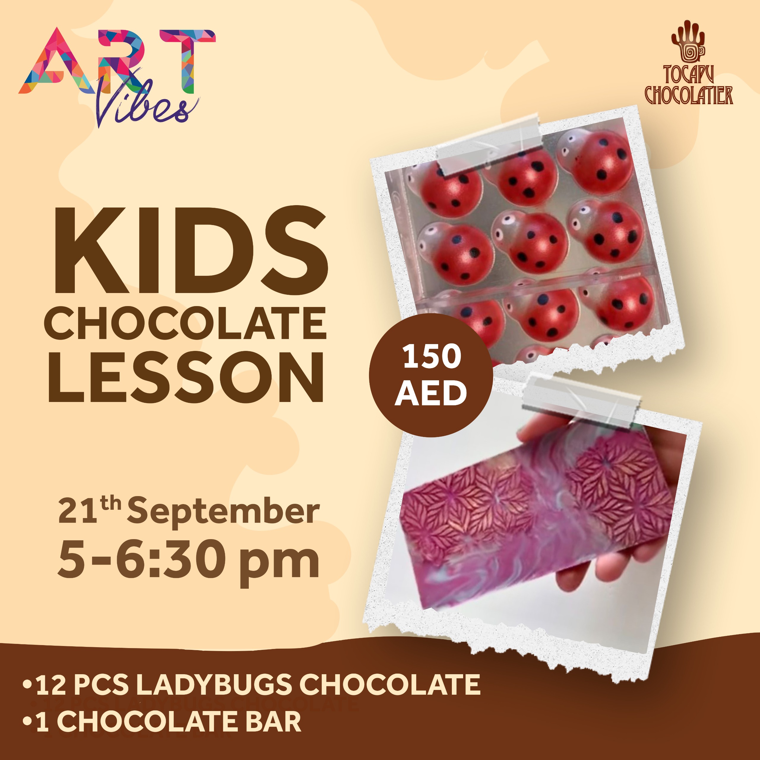 استعد لمغامرة ممتعة في Art Vibes Studio! انضم إلينا على 21 سبتمبر من من الساعة 5:00 مساءً إلى 6:30 مساءً لورشة عمل الشوكولاتة الممتعة المصممة خصيصًا للأطفال الذين تتراوح أعمارهم بين 4 وما فوق.