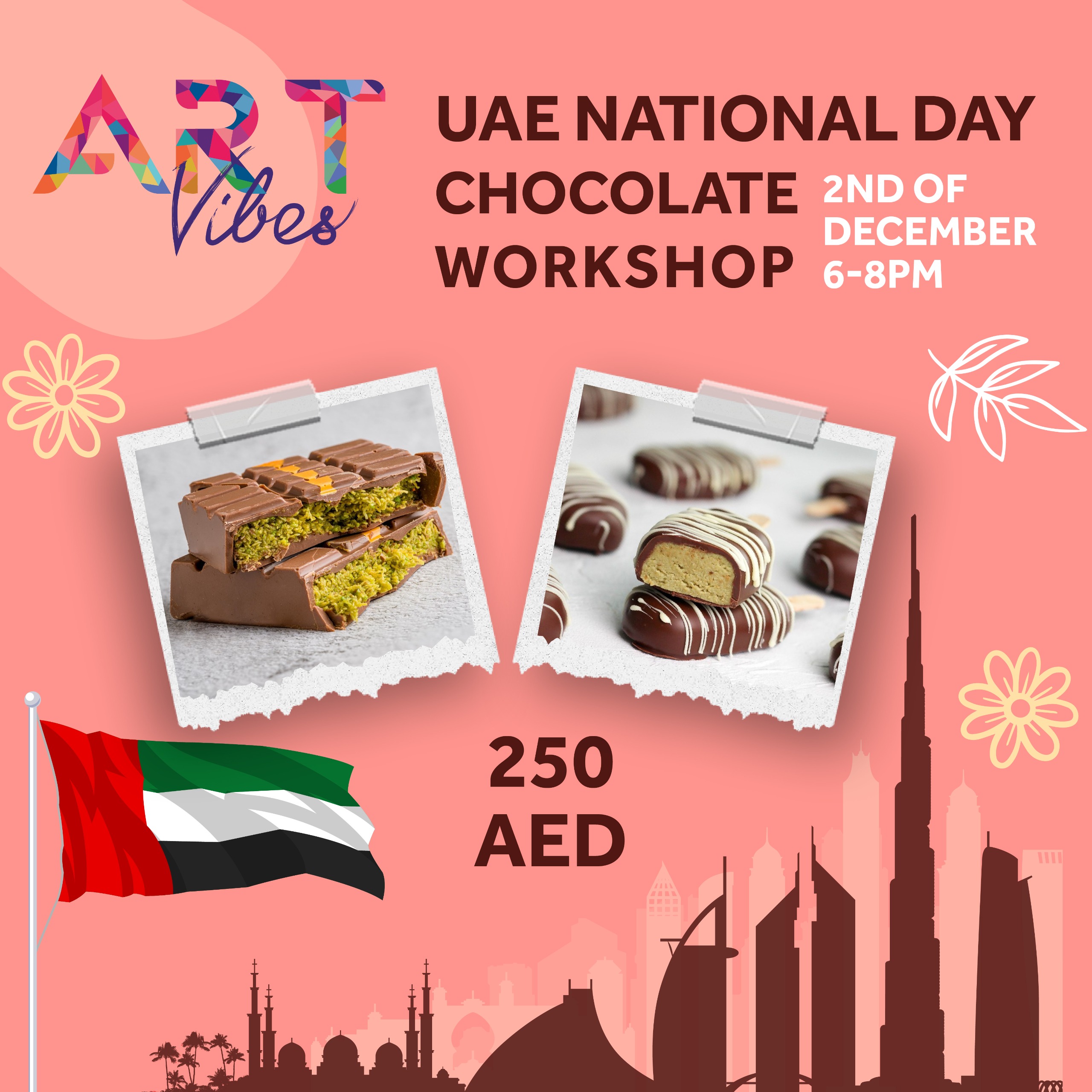 Join us for a special UAE National Day Chocolate Workshop at Art Vibes Studio on 2nd December 2024 from 6:00 to 8:00 PM! ๐ŸŽ‰โœจ