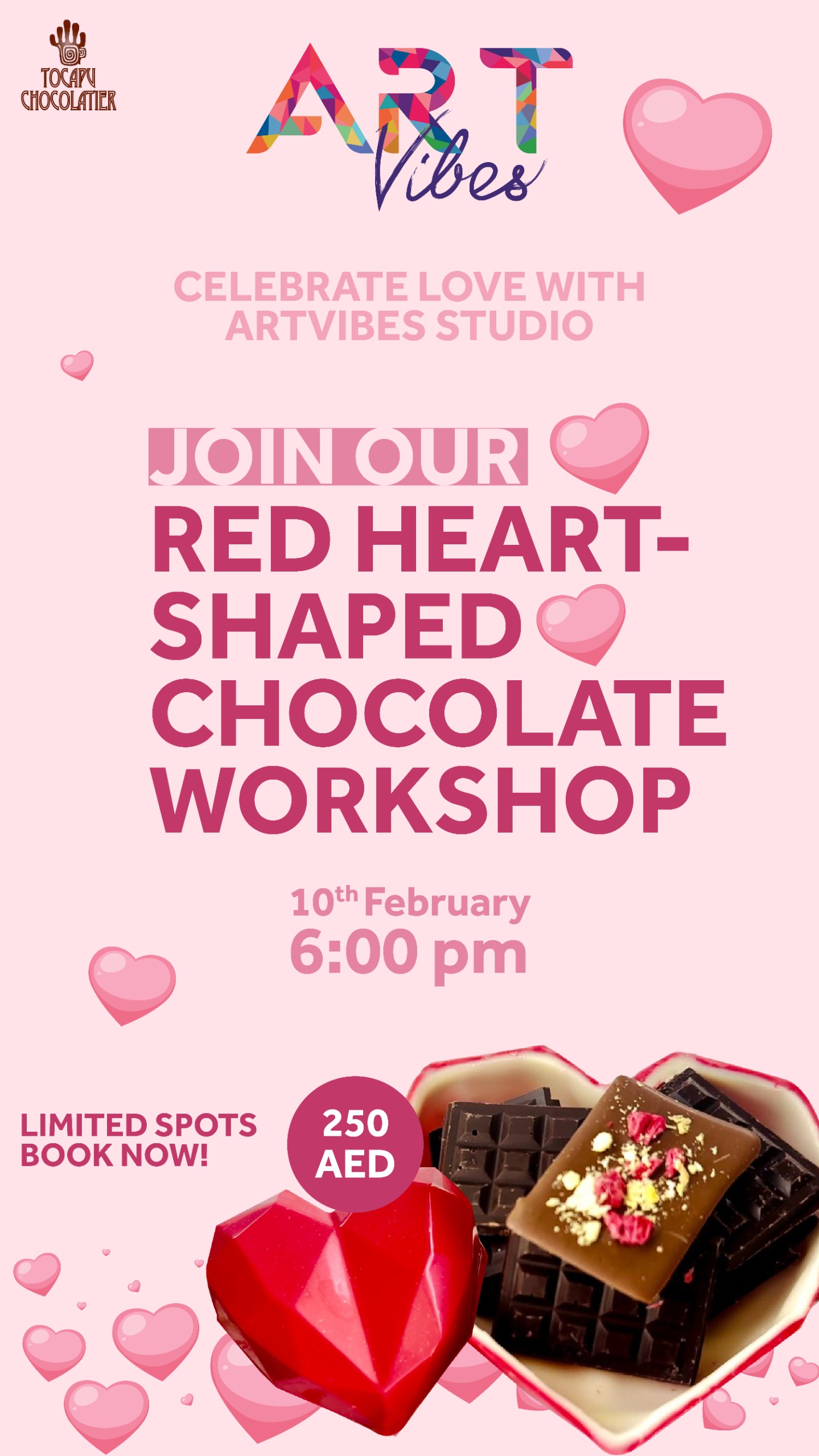 Valentine’s is around the corner, and we’ve got the sweetest way to celebrate! Join us at Art Vibes Studio for a fun & hands-on Chocolate Workshop where you’ll learn to make a beautiful red chocolate heart filled with little chocolate surprises! 🍬✨