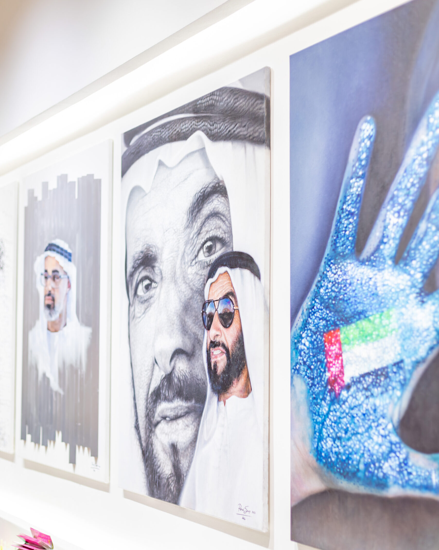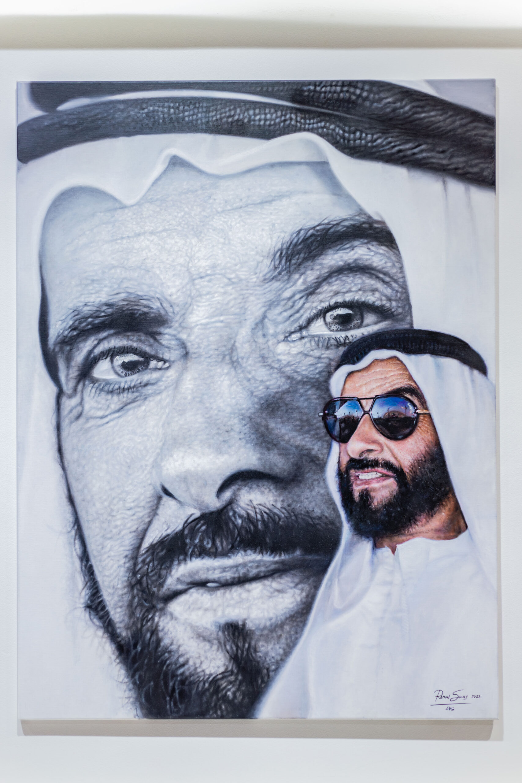 This hand-painted artwork, created using charcoal and oil paints on canvas, measures 120 x 90 cm. It honors Sheikh Zayed, the founding father of the UAE and the architect of its development. His legacy is indelible, and we will never forget him as his memory is an inherent part of our heritage, passed down through generations.