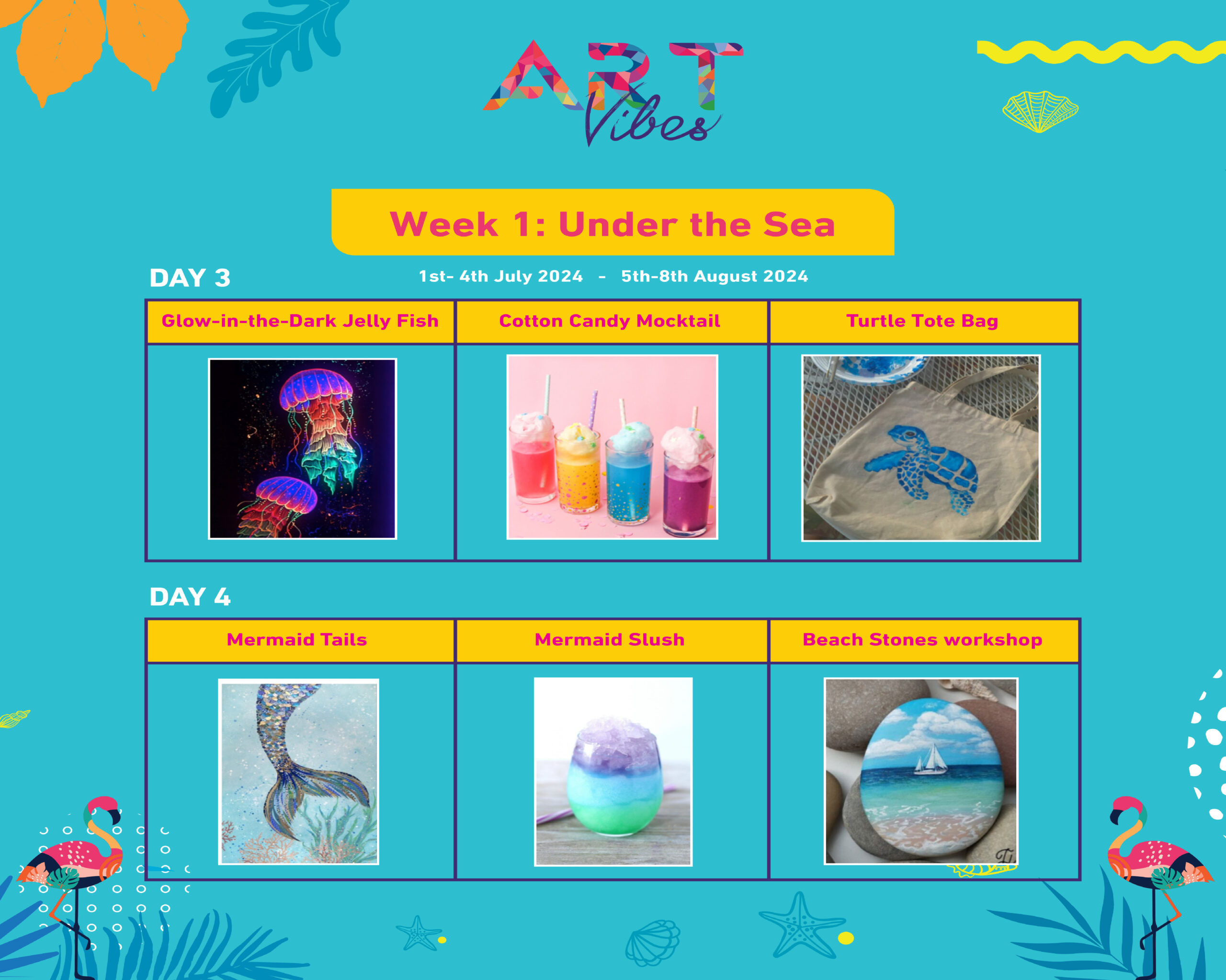 - Day 1: Funky Flamingo Painting, Pink Flamingo Cocktail, Summer Hat Workshop