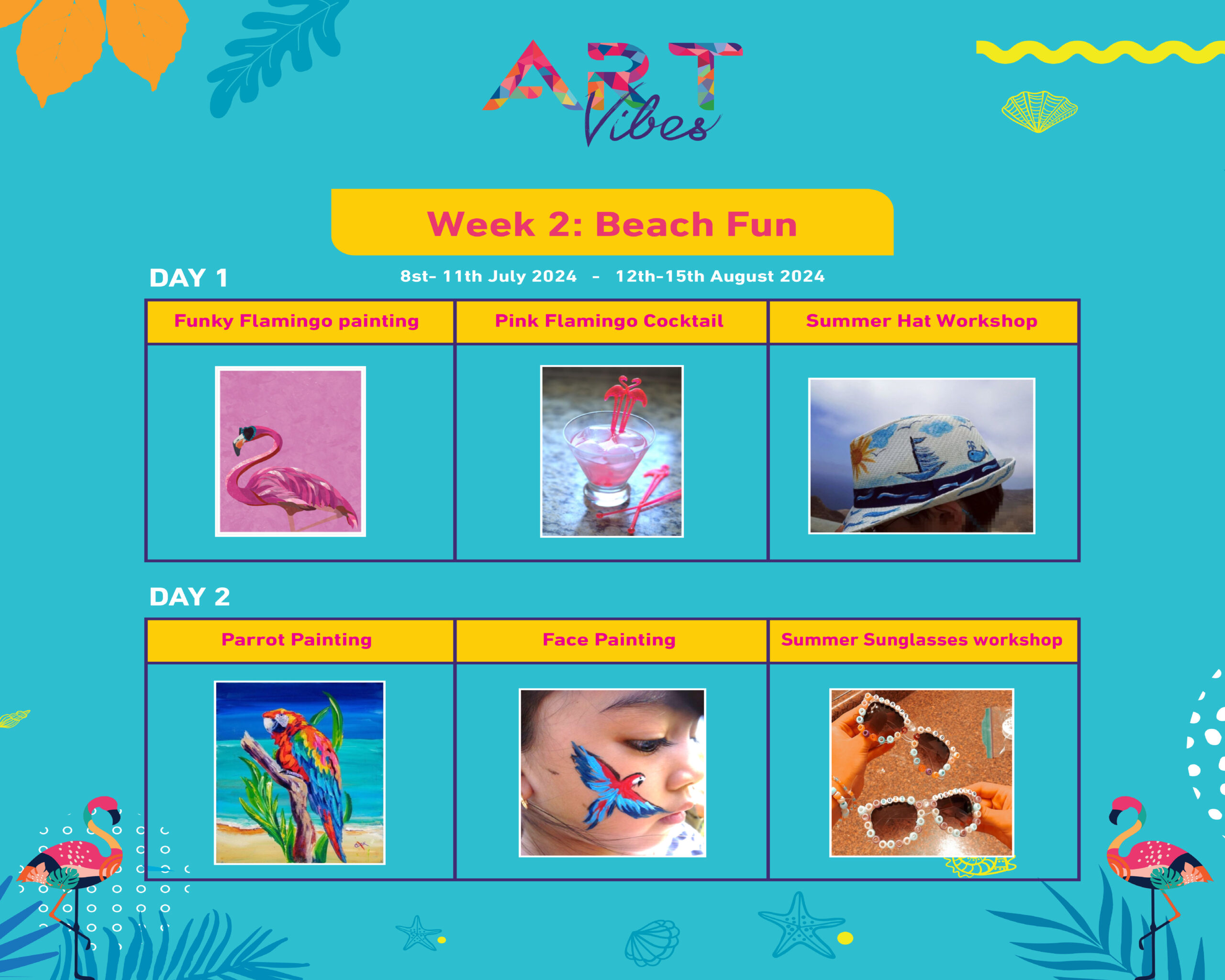 - Day 2: Parrot Painting, Face Painting, Summer Sunglasses Workshop