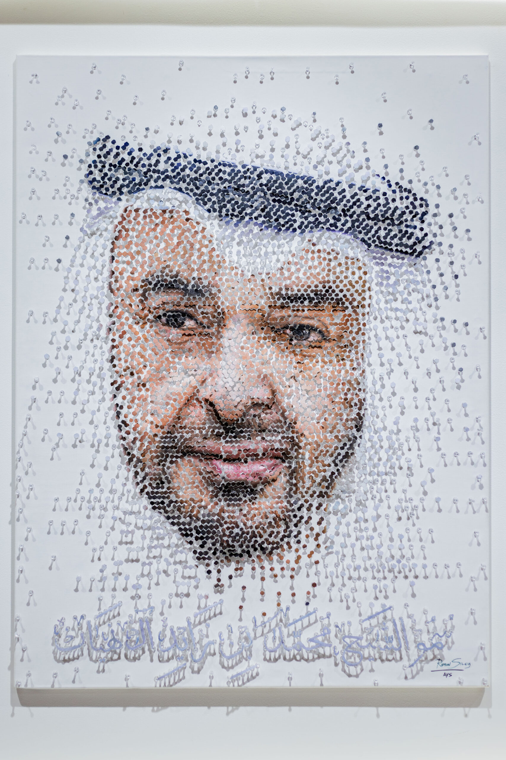 This hand-painted artwork, created using oil paints and adorned with over 3,000 three-dimensional pins, measures 120 x 90 cm. It celebrates His Highness the President of the UAE, our inspiring leader, beloved by the people of the Emirates and its residents. May God preserve him as a pillar of strength for our cherished nation.